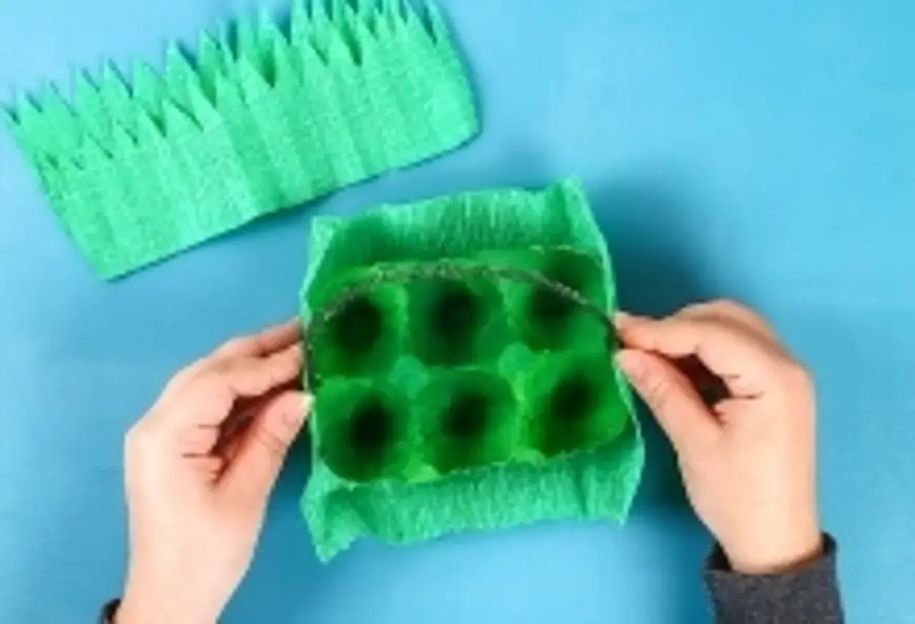 Im nächsten Schritt bekommt der Eierkarton eine Art Umschlag, damit er auch optisch zum Körbchen wird. Hierfür wieder zu Ton- oder Krepppapier greifen, idealerweise in grüner Farbe. Krepp ist etwas biegsamer und dadurch leichter zu verarbeiten, während Ton deutlich stabiler ist. Auch eine Kombination von Krepp- und Tonpapier ist möglich.