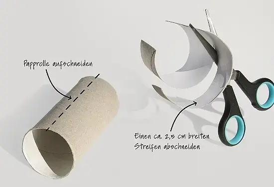 - Ihr Kind schneidet eine Papprolle von oben nach unten auf.