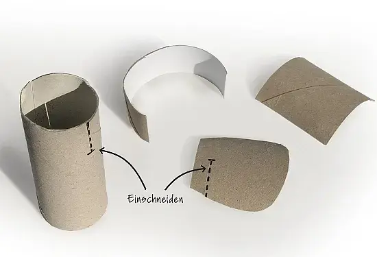 - Die zweite Rolle und die Ohren werden – wie auf dem Bild dargestellt – an der Strichlinie eingeschnitten und ineinander gesteckt.